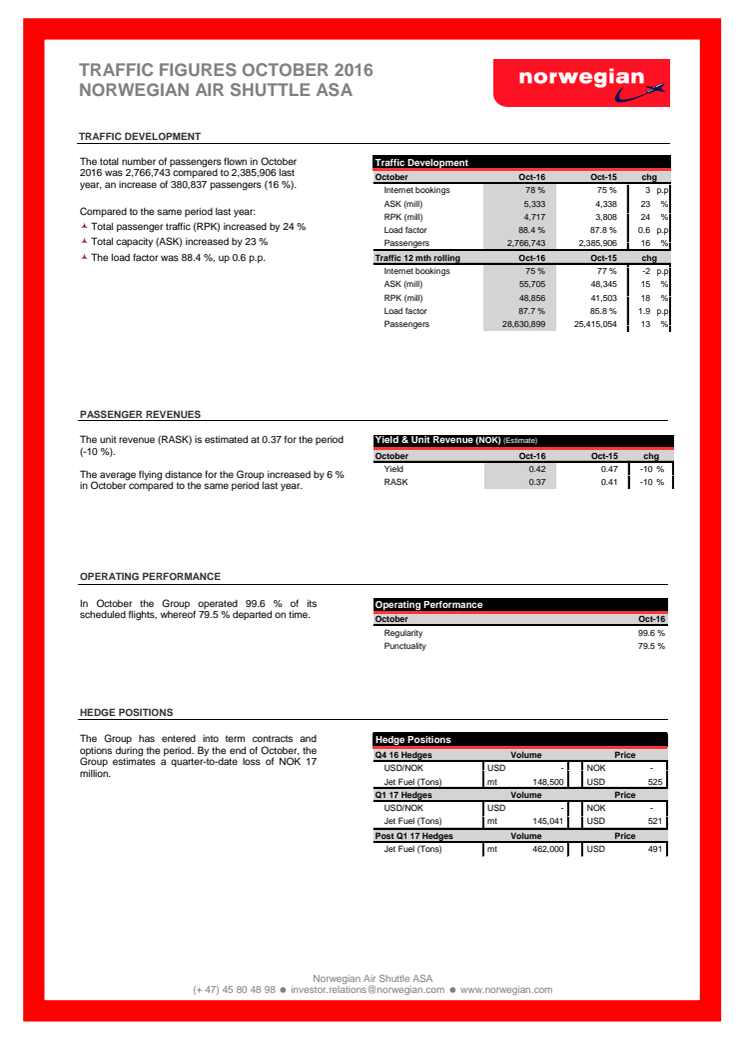 Norwegian traffic figures October 2016