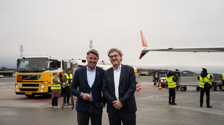 Norwegians koncernchef Geir Karlsen och Niels Hemmingsen, VD för Aalborg flygplats (från vänster) var på plats på Aalborg flygplats idag i samband med lanseringen.